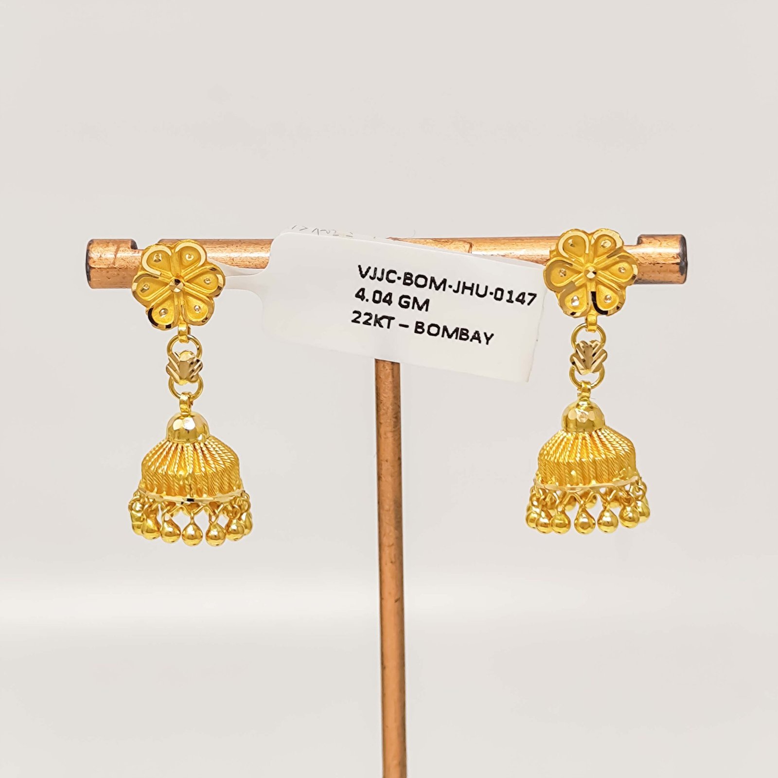 Adorn yourself with these exquisite 22KT gold jhumka earrings, showcasing a beautifully crafted floral stud top paired with an intricately detailed dome-shaped bell drop. Featuring delicate filigree work and a traditional silhouette, these jhumkas are a perfect blend of heritage craftsmanship and everyday elegance. Ideal for festive celebrations, weddings, and ethnic occasions, these earrings add a touch of royal grace to any outfit.