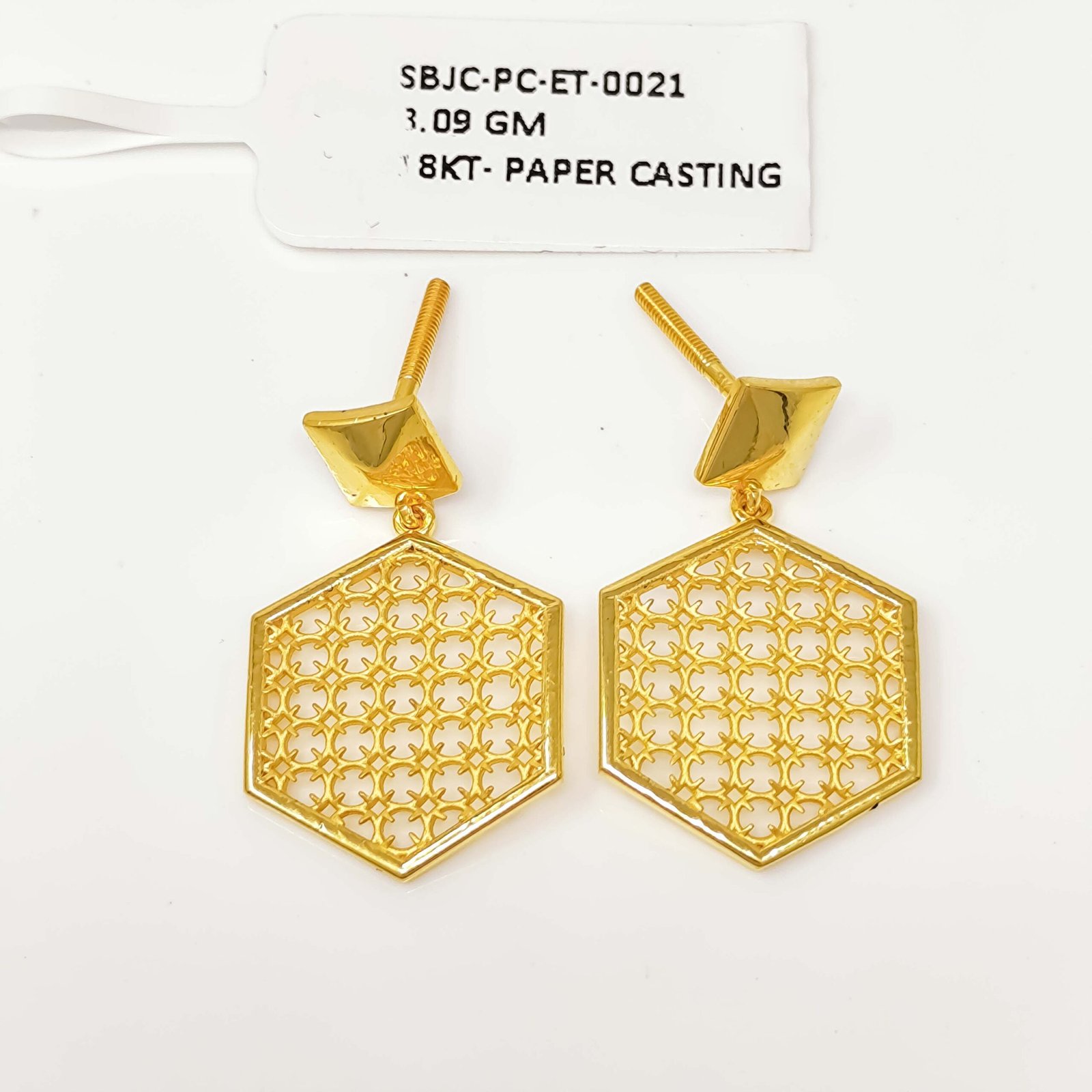 Introducing a stunning pair of gold earrings that beautifully blend artistry with wearability. Featuring an oval drop design crafted through the delicate paper casting technique, these earrings showcase an intricate cut-out pattern of geometric lines and curves that allow light to pass through, creating a gorgeous glowing effect. They are feather-light on the ears, making them ideal for all-day wear without any discomfort. The smooth dome stud top paired with the ornate dangling oval pendant strikes the perfect balance between simplicity and detail. Whether you’re dressing up for a special occasion or adding a touch of gold to your everyday look, these earrings are a timeless addition to any jewelry collection.