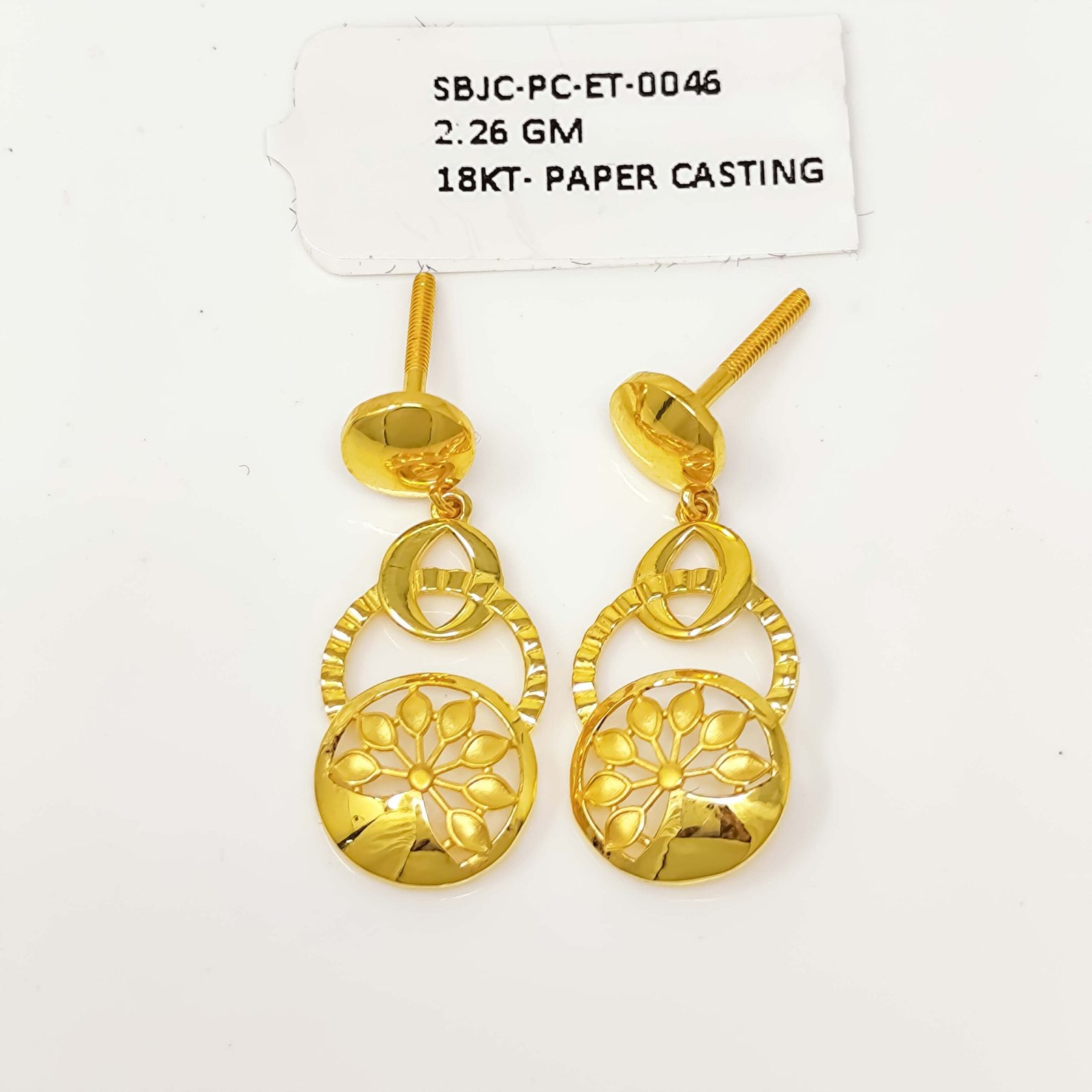 Introducing a stunning pair of gold earrings that beautifully blend artistry with wearability. Featuring an oval drop design crafted through the delicate paper casting technique, these earrings showcase an intricate cut-out pattern of geometric lines and curves that allow light to pass through, creating a gorgeous glowing effect. They are feather-light on the ears, making them ideal for all-day wear without any discomfort. The smooth dome stud top paired with the ornate dangling oval pendant strikes the perfect balance between simplicity and detail. Whether you’re dressing up for a special occasion or adding a touch of gold to your everyday look, these earrings are a timeless addition to any jewelry collection.