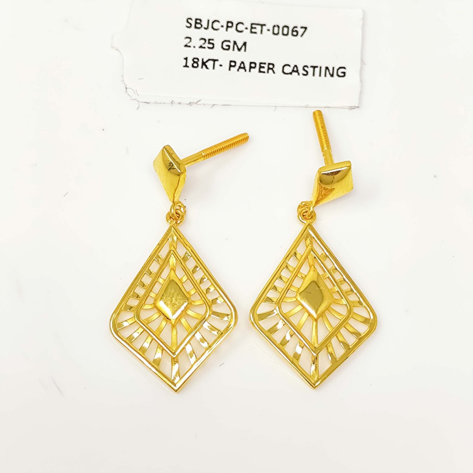 Introducing a stunning pair of gold earrings that beautifully blend artistry with wearability. Featuring an oval drop design crafted through the delicate paper casting technique, these earrings showcase an intricate cut-out pattern of geometric lines and curves that allow light to pass through, creating a gorgeous glowing effect. They are feather-light on the ears, making them ideal for all-day wear without any discomfort. The smooth dome stud top paired with the ornate dangling oval pendant strikes the perfect balance between simplicity and detail. Whether you’re dressing up for a special occasion or adding a touch of gold to your everyday look, these earrings are a timeless addition to any jewelry collection.