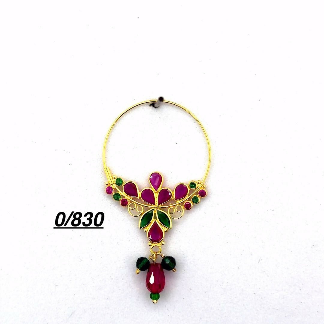 his exquisite traditional nose ring (nath) showcases masterful craftsmanship with its delicate gold-toned circular frame. The design features ornate filigree scrollwork that flows gracefully along the hoop, embellished with vibrant ruby red stones and sparkling clear crystals. At the centerpiece, a symmetrical floral motif commands attention with its deep red central stone surrounded by matching accents. The pendant drop adds dramatic flair with its rich magenta teardrop bead flanked by two emerald green stones, creating a striking color contrast. This piece perfectly balances traditional elegance with contemporary appeal, making it ideal for weddings, festivals, or special celebrations. The intricate detailing and quality stone setting reflect superior artisanship, while the lightweight design ensures comfortable wear.