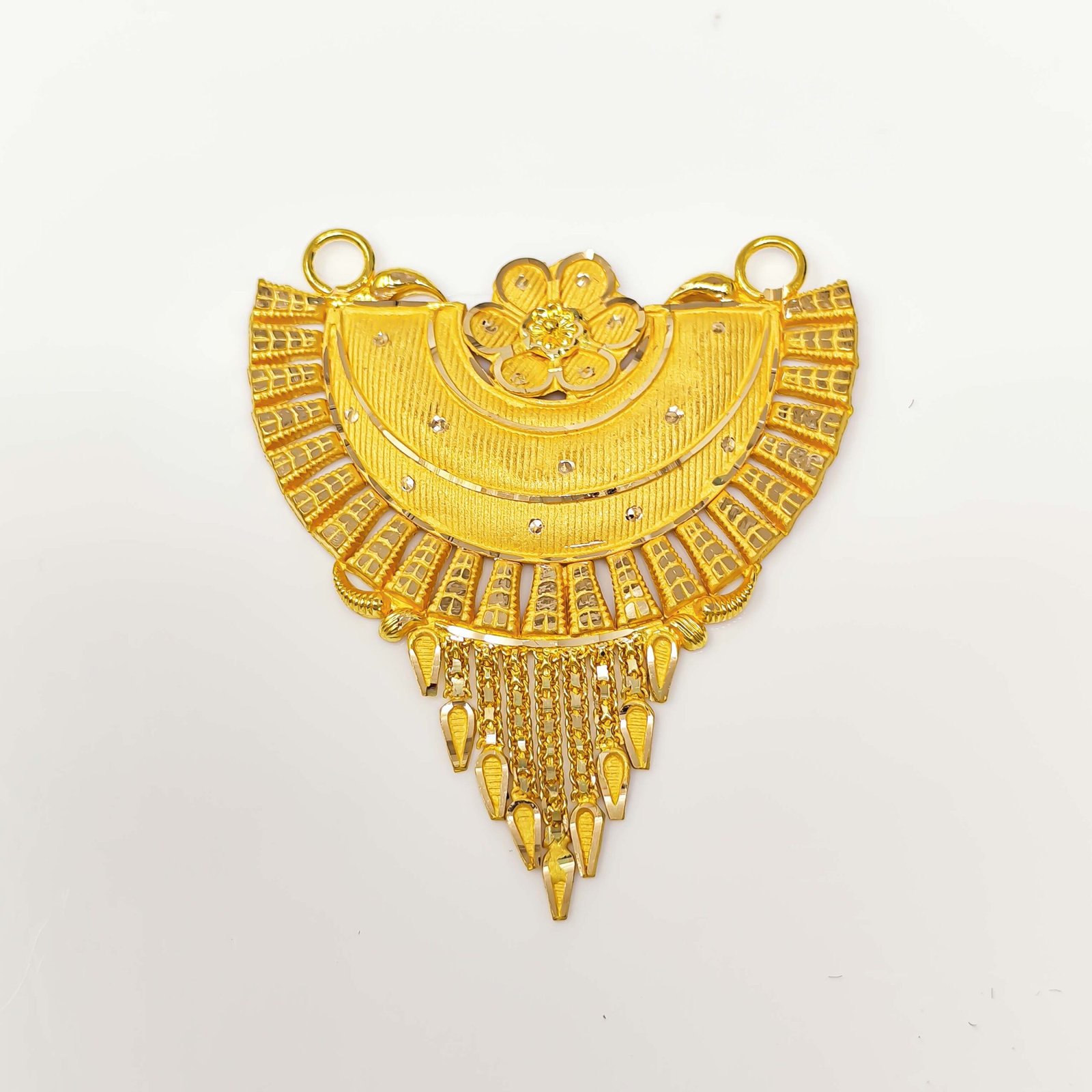 Presenting this stunning traditional gold choker pendant, a celebration of timeless Indian craftsmanship and intricate artistry. The piece features a gracefully curved top arch adorned with a row of delicately crafted oval and pineapple-shaped hanging drops, adding a sense of rhythm and elegance to the design. At the heart of the pendant sits a beautifully detailed circular medallion, richly engraved with fine filigree patterns that reflect the brilliance of traditional goldsmithing. The design flows downward into a charming double nakka finish — two elegant pointed drops flanking a central teardrop — creating a bold yet graceful V-shaped drop that is deeply rooted in classic Indian jewelry tradition. Bathed in a warm, lustrous 22KT gold tone, this pendant is designed to make a striking statement at weddings, engagements, pujas, and festive celebrations. Whether paired with a matching chain or worn as a standalone choker centerpiece, this piece is a true treasure of heritage jewelry craftsmanship.