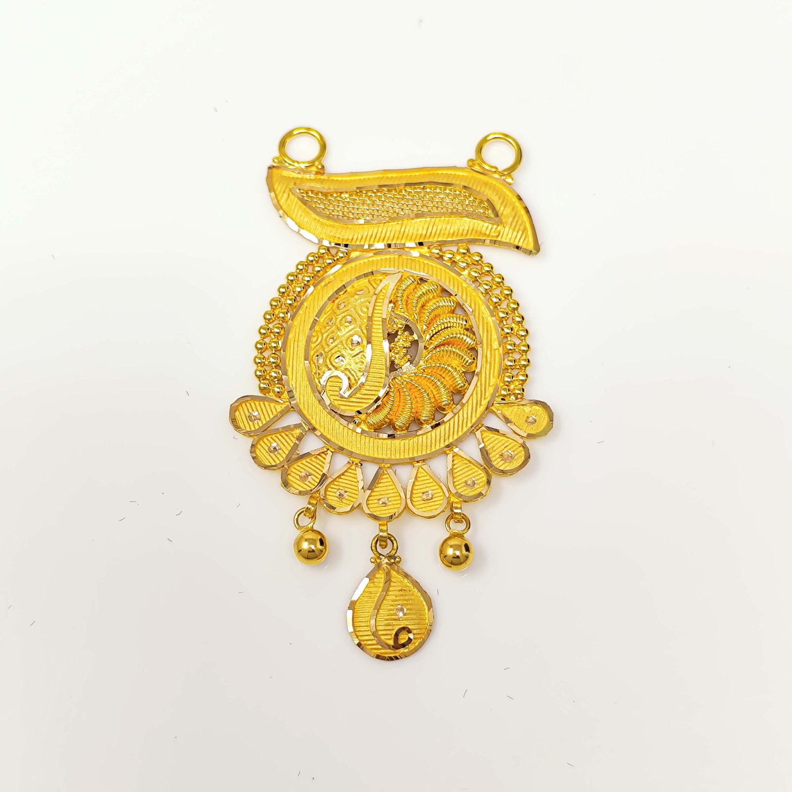 Presenting this stunning traditional gold choker pendant, a celebration of timeless Indian craftsmanship and intricate artistry. The piece features a gracefully curved top arch adorned with a row of delicately crafted oval and pineapple-shaped hanging drops, adding a sense of rhythm and elegance to the design. At the heart of the pendant sits a beautifully detailed circular medallion, richly engraved with fine filigree patterns that reflect the brilliance of traditional goldsmithing. The design flows downward into a charming double nakka finish — two elegant pointed drops flanking a central teardrop — creating a bold yet graceful V-shaped drop that is deeply rooted in classic Indian jewelry tradition. Bathed in a warm, lustrous 22KT gold tone, this pendant is designed to make a striking statement at weddings, engagements, pujas, and festive celebrations. Whether paired with a matching chain or worn as a standalone choker centerpiece, this piece is a true treasure of heritage jewelry craftsmanship.